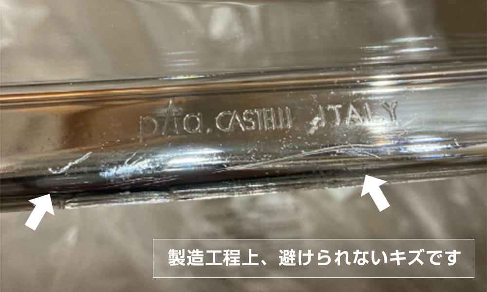 クロームメッキとポリカーボネートの素材特性上、どの製品にも発生することがあり、製品の強度、機能、安全性に影響するものではございません。
